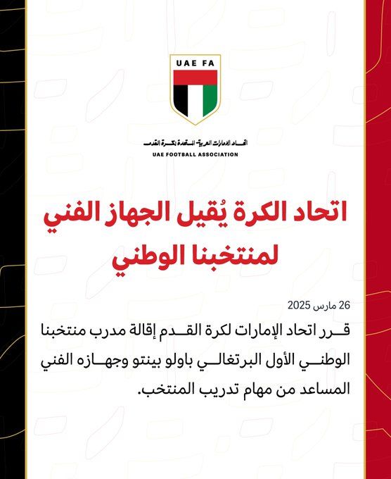 '에마라탈윰'은 같은 날 "UAE축구협회는 벤투 감독과 그의 코칭스태프를 해고했다"며 "포르투갈인 감독은 UAE 대표팀을 맡으면서 많은 실수를 저질렀다. 특히 UAE가 이란에 0-2로 완패한 뒤 신뢰를 회복하지 못했다. 북한과의 3차예선 8차전을 이겨야 유임이 가능했지만 결국 해고 됐다"고 알렸다.