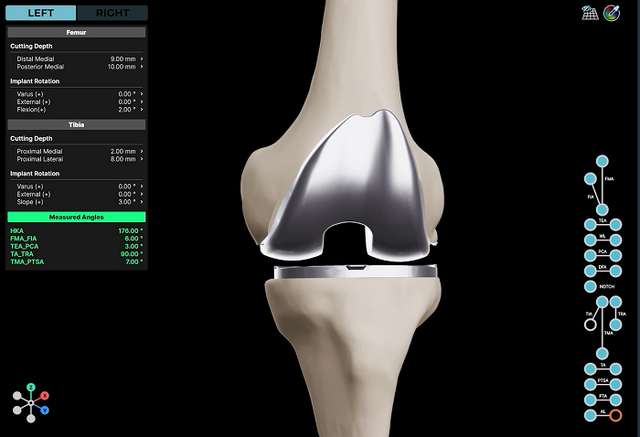 이 소프트웨어는 다양한 회전축 옵션을 제공하는 것도 강점이다. 대퇴골의 경우 WSL, TEA, FEA 회전축을, 경골에는 MTT, Akagi, Cobbs 회전축을 지원하며, 최근 각광받는 운동학적 정렬(kinematic alignment) 방식도 포함돼 있다. 또한 사용자들은 3D 스캔 또는 디자인 파일(STL 형식)을 통해 다양한 인공관절을 가상 수술에 적용할 수 있다.