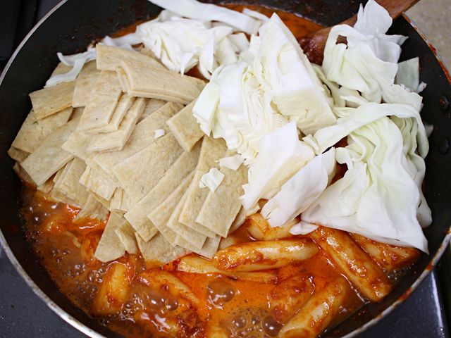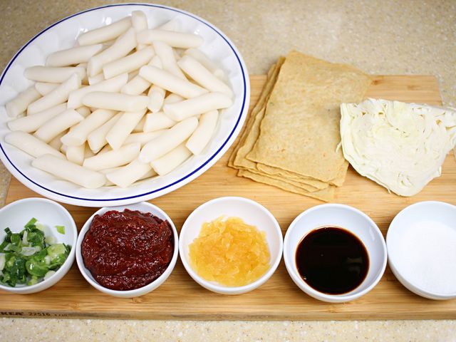 재료는 떡볶이떡, 어묵, 양배추, 대파,