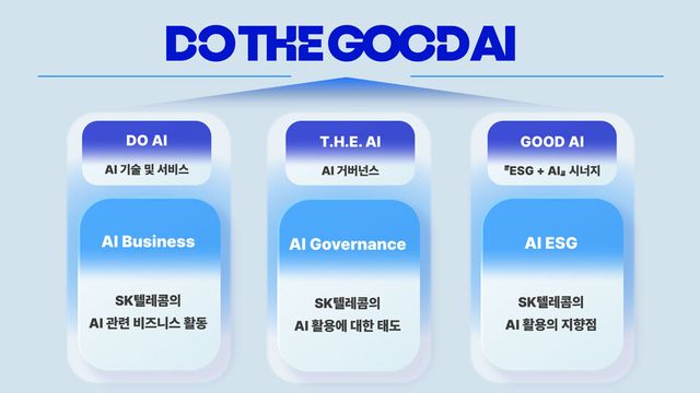 SKT가 새롭게 선보이는 ESG 비전 ‘DO THE GOOD AI’는 크게 3가지 영역 ‘DO AI’, ‘T.H.E. AI’, ‘GOOD AI’으로 구성됐다. AI로 통신과 기술의 경쟁력을 높이면서(DO AI), SKT가 지난해 3월 선보인 AI 거버넌스 ‘T.H.E AI(By Telco. For Humanity. With Ethics AI)’를 바탕으로 AI의 신뢰성과 안전성을 확보하고(T.H.E. AI), AI로 세상에 긍정적인 기여를 하도록 ESG 경영을 추진한다(GOOD AI)는 의미를 담았다.