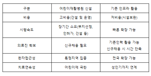 이에 따라 전문가들은 새 병원 설립이 아닌 기존 병원인프라 활용방안을 제시한다. 정부는 2020년 10월부터 진료과목에 재활의학과를 둔 병의원을 대상으로 어린이 재활의료기관 지정․운영 시범사업을 진행 중이다. 차라리 이 시범사업을 활용하면 예산이 수십억원 수준으로 낮춰져 신축 대비 1/10 이하의 비용이 소모된다는 것.