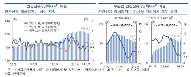 다만, 전분기 대비로는 가계와 기업 신용 레버리지가 모두 낮아졌다. 가계신용은 2021년 4분기 말. 기업신용은 2023년 4분기말 이후 GDP대비 비율이 하락세다.