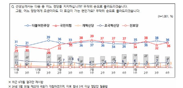 지난 24~26일 엠브레인퍼블릭, 케이스탯리서치, 코리아리서치, 한국리서치가 공동 조사해 27일 발표한 전국지표조사(NBS) 결과에 따르면, 민주당과 국민의힘이 지지율 동률을 이뤘다. 민주당과 국민의힘이 모두 36%였다. 조국혁신당은 7%, 개혁신당은 3%, 진보당이 1%였다. 태도를 유보하겠다고 답변한 비율은 17%였다.