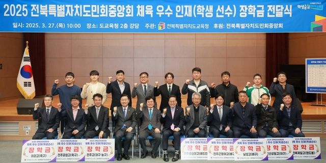 | ▲ 2025전북특별자치도민회중앙회 체육우수인재 장학금 전달식이 27일 전북특별자치도교육청 2층 강당에서 열렸다. |