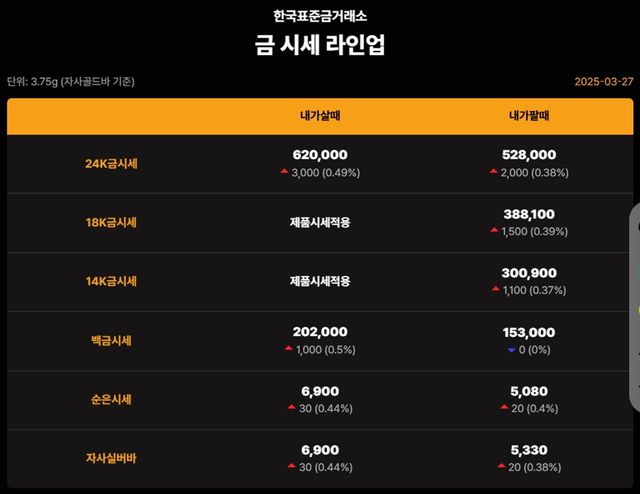 순금(24K) : 매입가 62만 1000원 / 매도가 52만 7000원