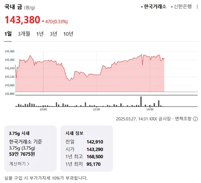 국내 금시세(금값)가 27일(한국 시각) 오후 상승세(전 거래일 대비)를 보이고 있다.