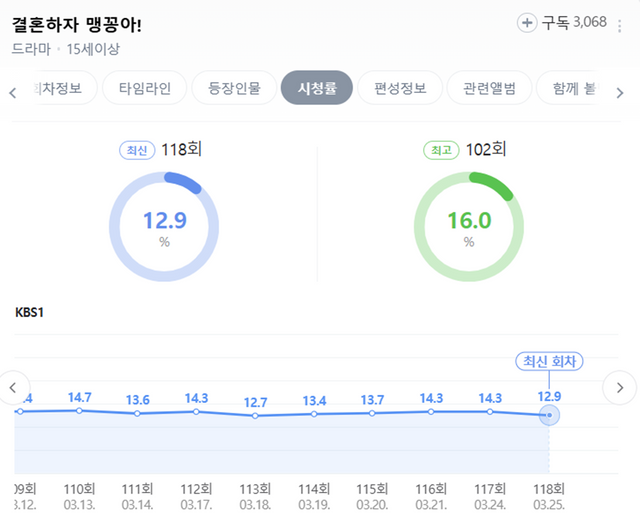 kBS1 일일드라마 '결혼하자 맹꽁아' 시청률 추이 / 네이버