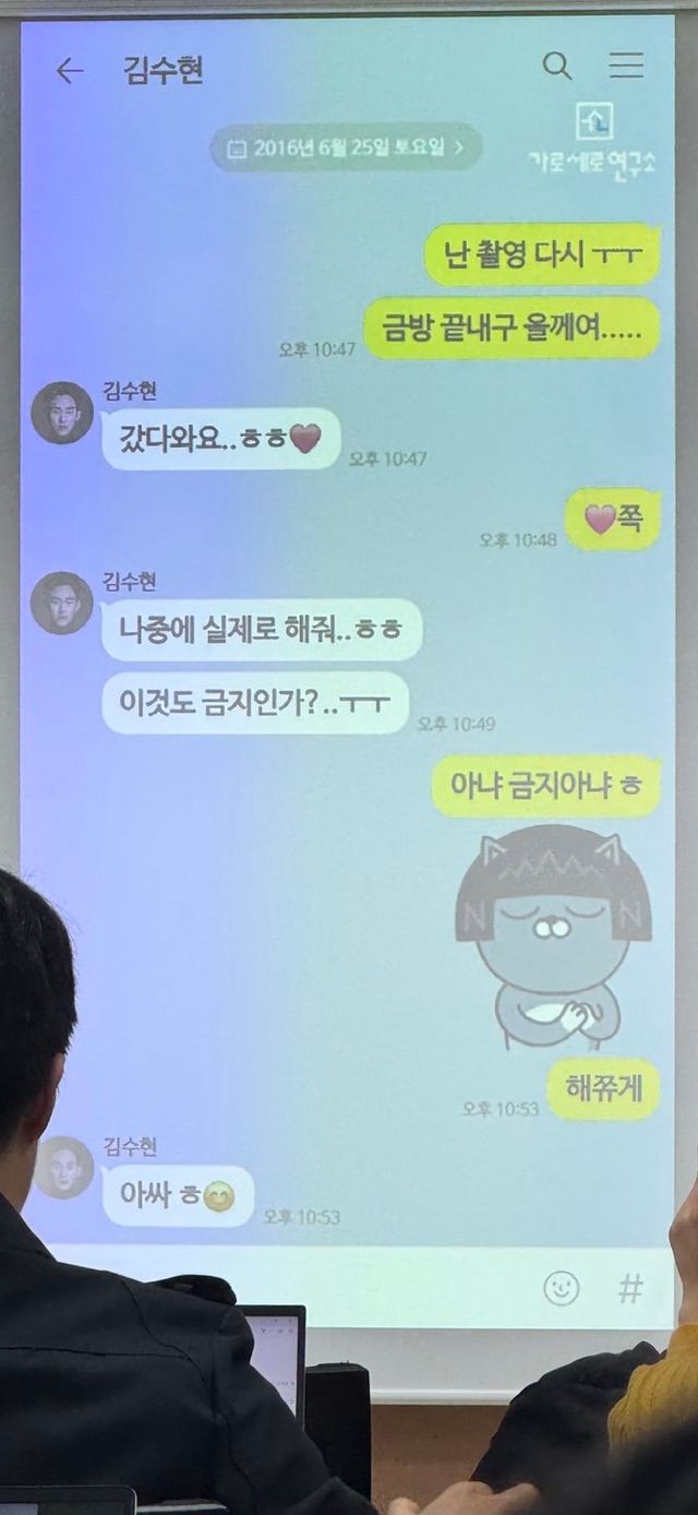 이날 공개된 카톡은 2016년 6월 김수현과 김새론이 나눈 것이다. 2000년생인 김새론이 16세 시절이다.