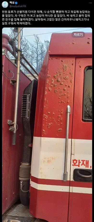 현직 소방관이자 작가로 활동하고 있는 백경(필명)은 이날 자신의 엑스에 산불 작업에 투입된 소방차 사진을 올렸다. 8년차 소방관으로 일하고 있는 그는 올해 1월 ‘당신이 더 귀하다 (아픔의 최전선에서 어느 소방관이 마주한 것들)’는 제목의 수필집을 출간한 바 있다.