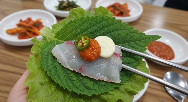 쌈 위에 회와 마늘, 고추, 쌈장을 넣은 모습 / 위키트리