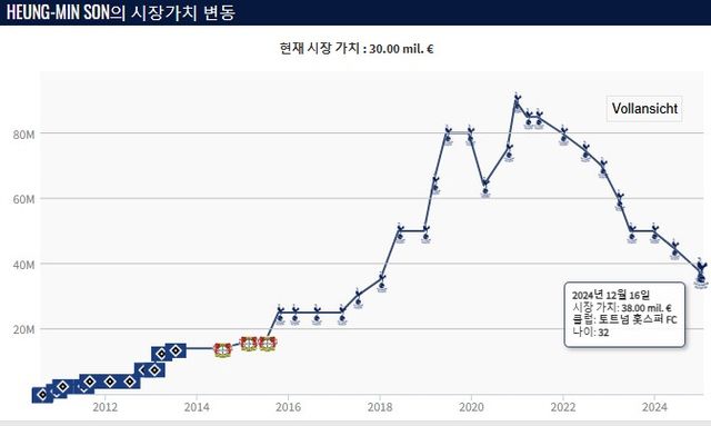 독일 축구 이적시장 전문 사이트 '트란스퍼마르크트'에 따르면 현재 손흥민 추정 몸값은 3000만 유로(약 473억원)이다. 지난해 12월까지 추정 몸값은 3800만 유로(약 600억원)였다. 약 3개월 만에 크게 하락했다.