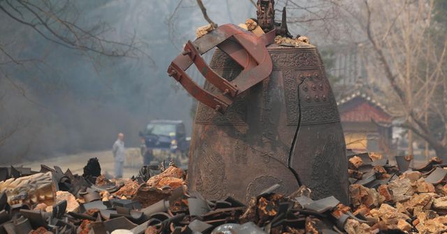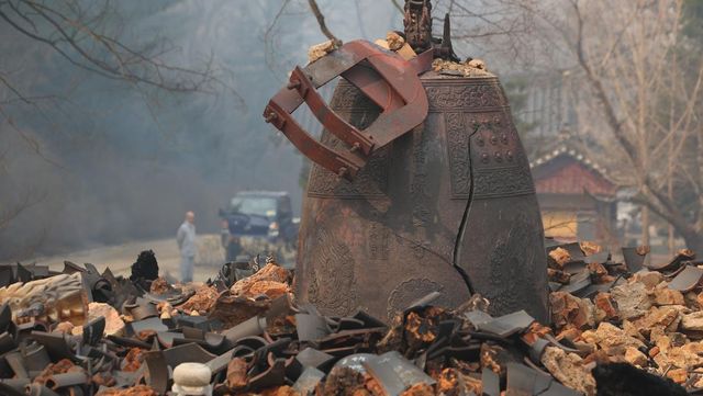 경북 의성군 단촌면 고운사 범종이 불에 타 깨져 있다. / 연합뉴스