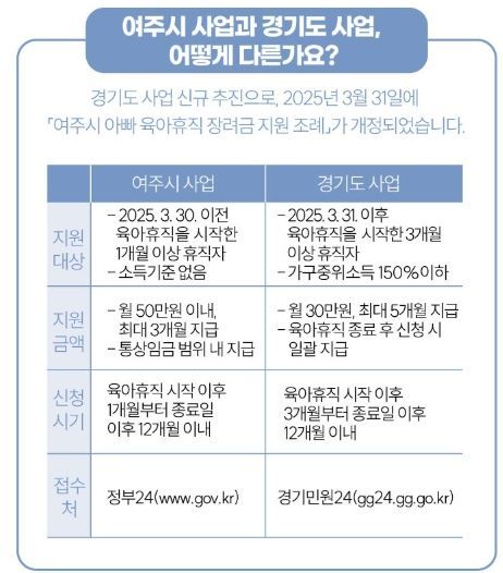 달라진 ‘아빠 육아휴직 장려금’은 가구 기준중위소득이 150% 이하이면서 3개월 이상 휴직한 육아휴직자에게 월 30만원씩 최대 5개월간 지원된다. 그리고 육아휴직 종료 후에 신청하면 5개월분이 일괄 지급된다. 신청은 경기민원24(gg24.gg.go.kr)에서 가능하며, 육아휴직 시작 이후 3개월부터 종료일 이후 12개월 이내에 신청할 수 있다.