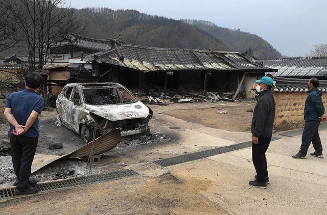 27일 경북 청송군 경북 청송군 파천면 덕천마을에 산불이 번져 주택과 차량이 불에 타 있다. 경북 의성군에서 시작된 산불이 안동·청송·영양·영덕으로 번지며 엿새째 꺼지지 않고 있다. / 뉴스1