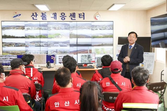 [와이뉴스] 안산시의회 박태순 의장이 27일 안산시 산불대응센터를 방문해 산불전문진화대 대원들을 격려하고 안전의 중요성을 강조했다.