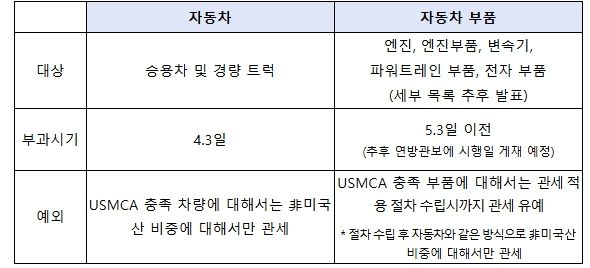 美 현지시간 3월 26일 17시경 발표된 美 정부 포고령에 따르면, 美 무역확장법 232조에 근거하여 자동차는 4월 3일부터, 부품은 5월 3일 이전에 관세가 부과될 예정이다.