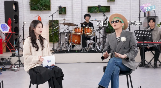 지드래곤이 “근처에서 밭매다가 잠시 들렀다”고 말하자 아이유는 “지용 씨 스타일의 치마바지를 입었다”고 각자의 패션에 대해 소개했다.