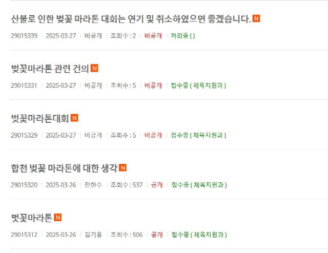 합천군청 누리집 ‘군민의 소리’ 게시판에는 마라톤대회에 대한 부정적 의견이 게시됐다.