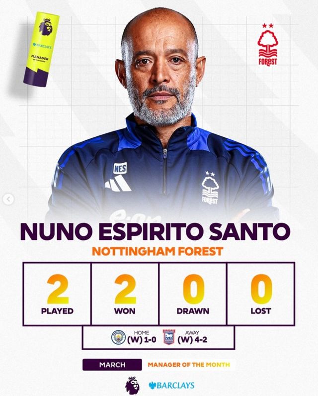 누누 감독은 지난 10월과 12월 이달의 감독상도 수상한 바 있다. 12월 기세가 대단했다. 당시 누누 감독의 노팅엄은 12월 첫 경기였던 맨체스터 시티전에서는 0-3으로 패배했으나 이후 5연승을 달렸다. 맨체스터 유나이티드 원정에서 3-2로 누르는 저력을 보여주었고, 아스톤 빌라까지 2-1로 잡아냈다. 이후 브렌트포드, 토트넘 훗스퍼, 에버턴까지 모두 누르고 승리를 따냈다. 심지어 빌라전 이후 3경기 동안 실점은 한 골도 없었다.