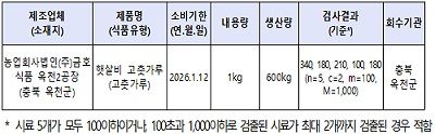 식약처 식품안전정책국은 “충북 옥천군청이 해당 제품을 신속히 회수 조치하도록 했다”며, “해당 제품을 구매한 소비자에게 섭취를 중단하고 구입처에 반품해 줄 것을 당부한다”고 밝혔다.