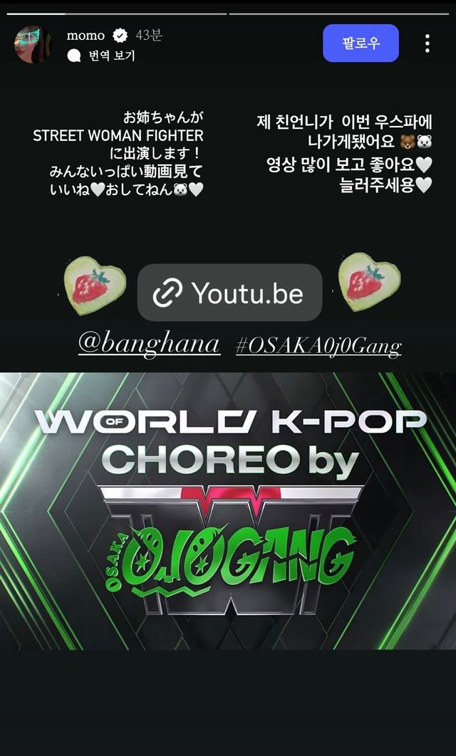 영상이 공개된 후 모모는 개인 SNS에 "제 친언니가 '스우파'에 나가게 됐다. 영상 많이 보고 좋아요 눌러달라"고 적극 홍보, 남다른 우애를 보여주기도 했다.