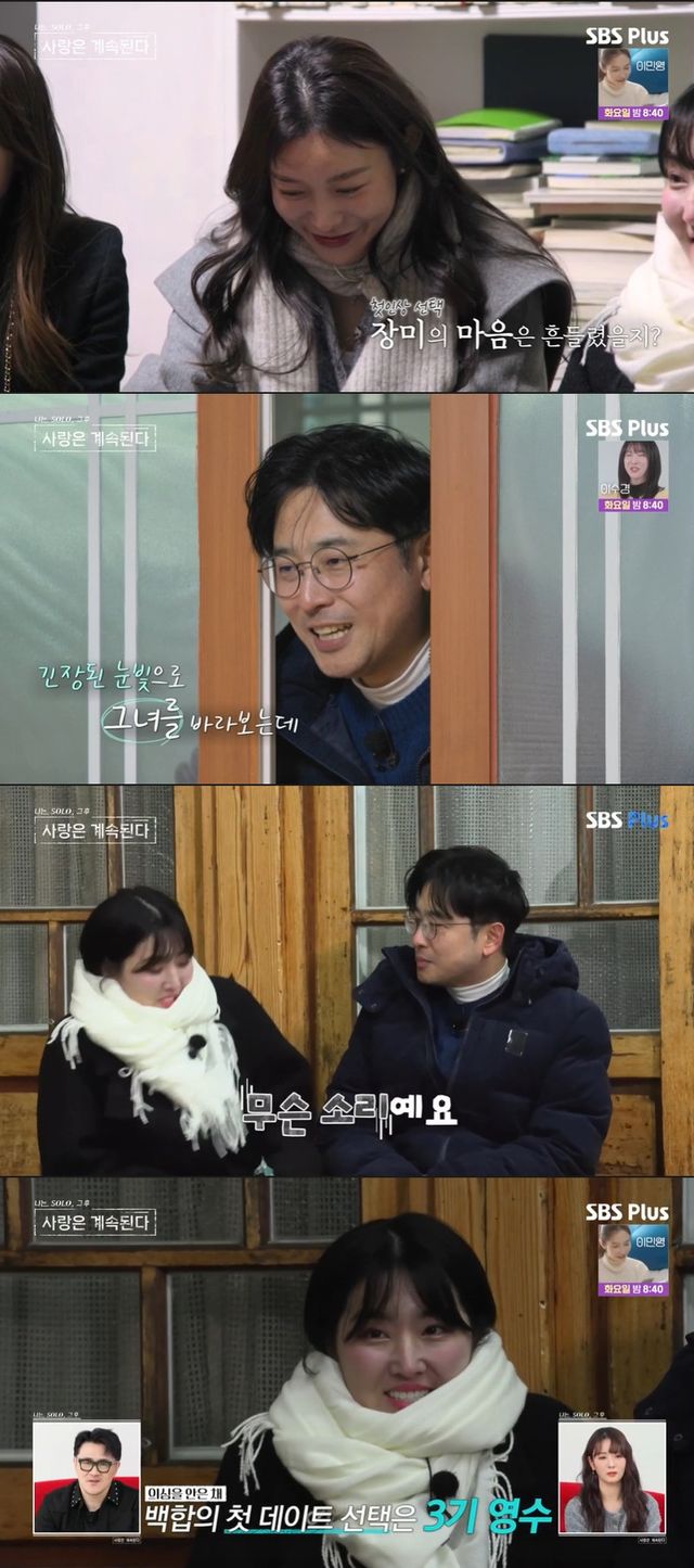 백합은 "영수 님도 저랑 먹어서 즐거우면 좋겠다"며 3기 영수를 향한 호감을 드러냈고, 3기 영수는 "행복하다. 아니었으면 22기 영식이 형과 같이 (혼자 남았다)"라고 답했다.