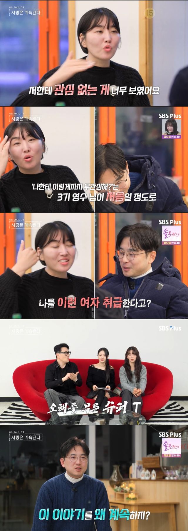 3기 영수의 적극적이지 않은 모습에 백합은 "솔직하게 얘기하면 영수 님을 선택하고 후회했다. 너무 저한테 관심 없는 게 보였다"며 여태껏 쌓여온 실망감을 토로했다.