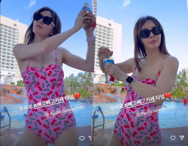공개된 영상 속 안선영은 해외여행 중 야외 수영을 즐기려는 모습이다. 체리 패턴 핑크 원피스 수영복을 입은 안선영은 물을 마시는 와중에도 흥을 주체하지 못하고 몸을 흔들고 있다. 특유의 해맑은 모습뿐 아니라 수영복을 군살 없이 소화하는 슬림핏 몸매가 눈길을 사로잡는다.