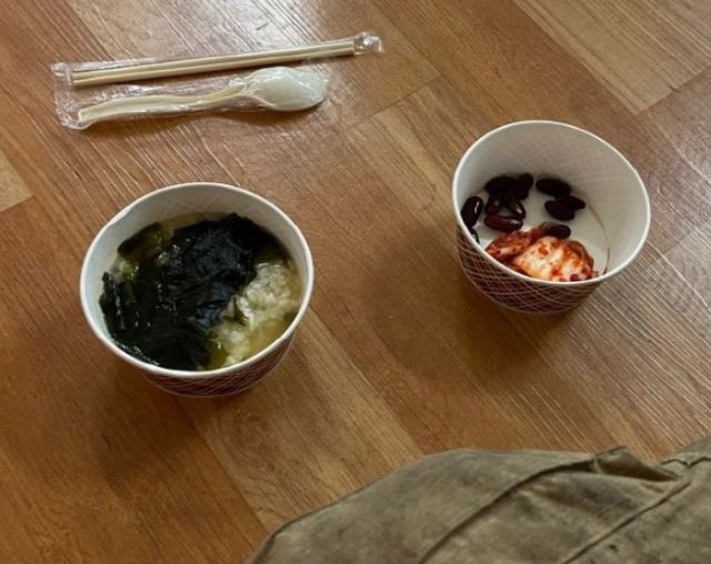 특히 눈길을 끈 건 한눈에 봐도 부실한 식단이었다. 미역국에 밥이 말아져 있었고 반찬은 콩자반과 김치가 다였다.