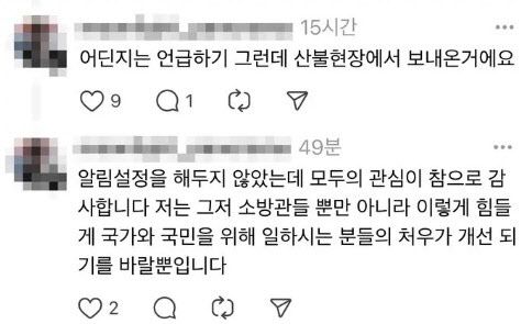 이에 A씨는 “모두의 관심 참으로 감사하다. 저는 그저 소방관들뿐만 아니라 이렇게 힘들게 국가와 국민을 위해 일하는 분들의 처우가 개선되기를 바랄 뿐이다”고 했다.