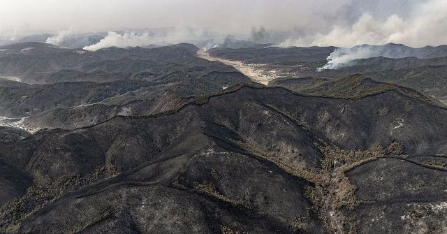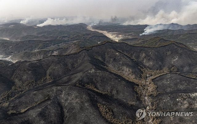 경북 의성군 산불 발생 나흘째인 25일 산불이 휩쓸고 간 의성군 산림이 폐허가 된 모습을 보이는 가운데 산불이 안동시 쪽으로 번져나가고 있다. 지난 22일 발생한 의성 산불의 산불영향규모는 현재까지 1만2천565㏊로, 2000년 4월 강원 강릉·동해·삼척·고성 산불(2만3천913ha), 2022년 3월 경북 울진·강원 강릉·동해·삼척 산불(2만523ha)에 이어 국내 산불 피해 규모로는 세 번째로 큰 것으로 파악되고 있다. / 연합뉴스