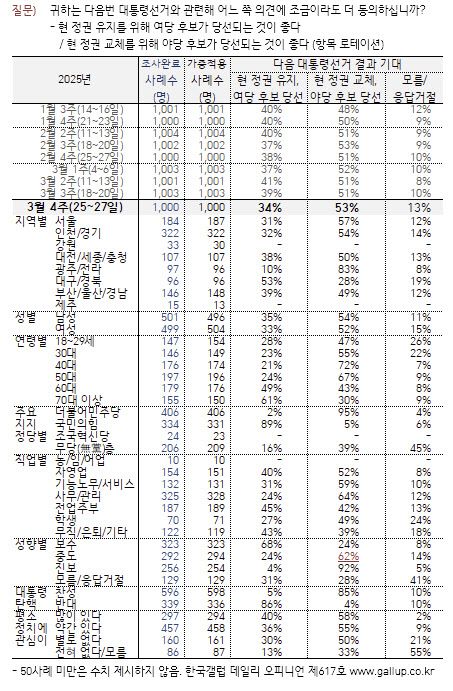 여론조사 전문기관 한국갤럽이 25~27일 실시한 조사에 따르면 다음 대선에 관해 ‘현 정권 교체를 위해 야당 후보가 당선되는 것이 좋다’고 답한 응답한 비율은 53%였다. 전주(51%)보다 2%포인트 상승한 값이다. 반면 ‘현 정권 유지를 위해 여당 후보가 당선되는 것이 좋다’는 응답자 비율은 34%로 지난주보다 5%포인트 하락했다. 갤럽이 올 1월 셋째 주부터 차기 대선 결과에 관한 조사를 시작한 이래 가장 낮은 수치다.