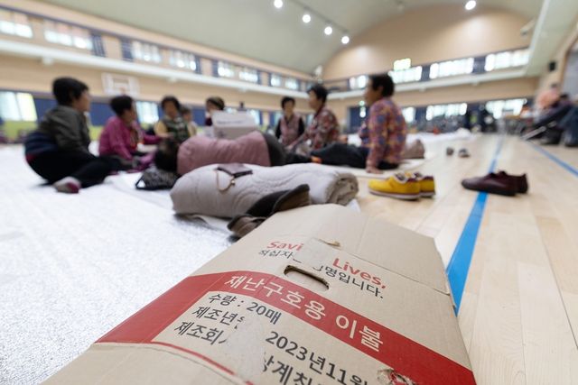 26일 경북 안동시 용상초등학교 체육관에 마련된 산불 임시 대피소에 안동 시민들이 자리하고 있다. / 뉴스1