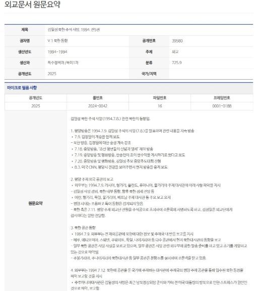 이번에 공개되는 문서에는 북한 핵 문제 관련 제3단계 미‧북 고위급 회담 및 제네바 합의, 김일성 북한 주석 사망, 남북한 정상회담 개최 추진, 김영삼 대통령 중국·일본 및 러시아 방문 등이 포함되어 있다.