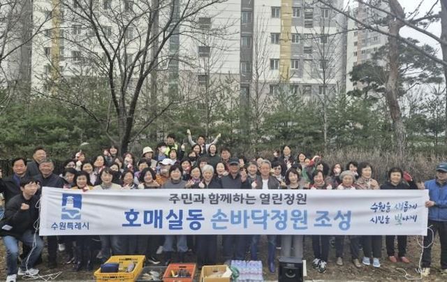 이날 권선구 호매실동 단체원과 지역 주민 70여 명은 뜻을 모아 마을의 자투리땅에 수국 나무 500여 주를 심었다. 수원시는 마을 자투리땅, 유휴지 등 도시의 빈 곳에 시민 공동체가 꽃과 나무 등을 심어 정원을 만드는 ‘손바닥정원 사업’을 추진하고 있다.