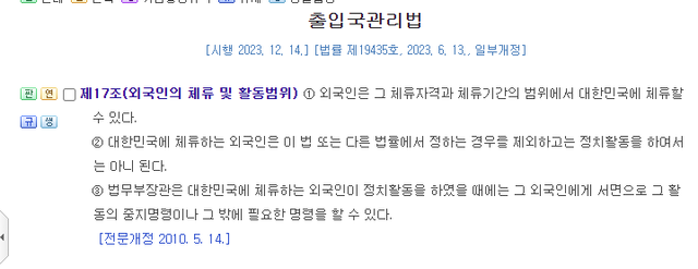 참고로 출입국관리법 17조에 따르면