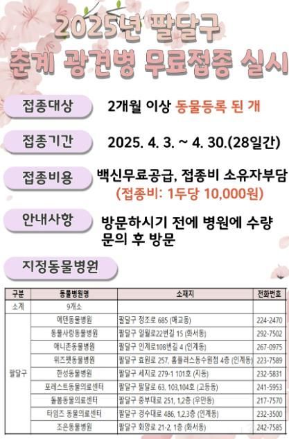 팔달구는 “반려동물의 건강을 지키기 위해 광견병 예방접종은 필수적이며 모든 반려견주의 적극적인 참여를 부탁드린다”고 전했다.