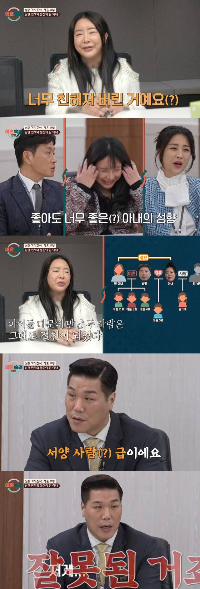 서장훈은 "저게 잘못된 거다 저런 것들이 아내에게 마음을 더 열수가 없는 거다. (아이들은) 이 집에 아버지 하나에 엄마 두 명이고 이게 무슨 상황인지. 나이도 어린데. 이분(남편)은 어떡하냐, 사이가 안 좋아져서 이혼했는데"라고 일침 했다. 남편 또한 "저는 계속 말렸는데"라고 말했다.