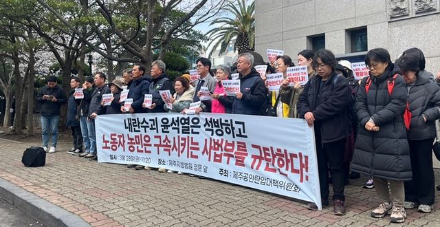 그러면서 "내란을 일으켜 국가와 온 국민을 도탄에 빠지게 한 윤석열은 납득이 가지 않는 이유로 석방하고 힘없는 노동자와 농민은 구속하는 것은 도대체 어느나라 사법부이며 어느나라의 법이란 말인가"라며 "이번 사태를 강력 규탄하고 석방을 위해 제주도민사회 전체가 강력히 연대운동을 펼쳐나갈 것"이라고 강조했다.
