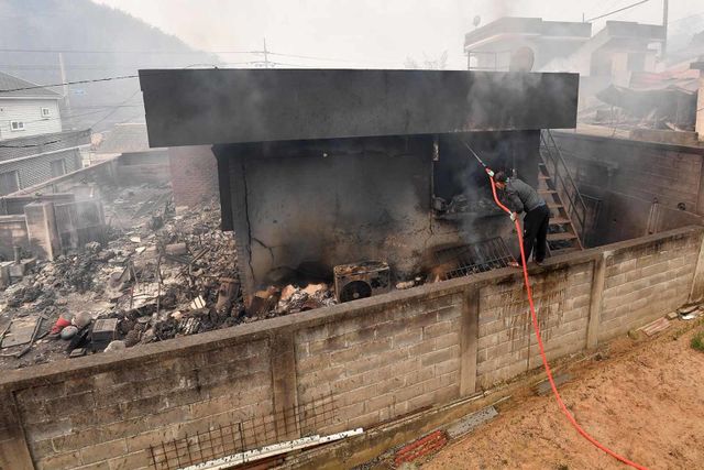 경북 의성 산불이 강풍을 타고 영덕으로 확산된 26일 오전 영덕읍 매정 1리 마을에서 주민이 주택에 님아 있는 불을 끄고 있다. / 뉴스1