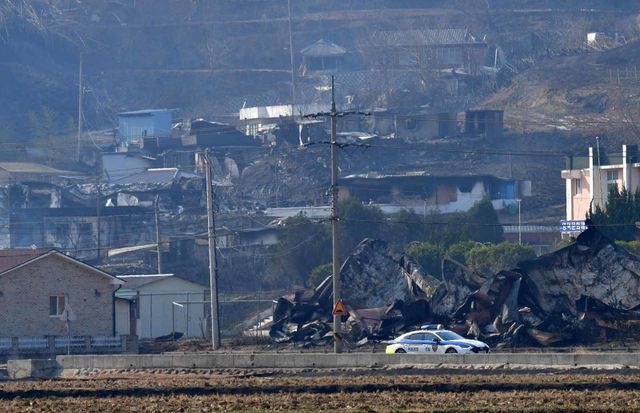 지난 22일 경북 의성군에서 시작된 산불이 강풍을 타고 영덕군까지 확산된 26일 오후 화마를 피하지 못한 영덕읍 매정 1리 마을이 쑥대밭으로 변해있다. / 뉴스1