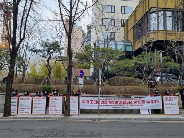 정기 주총이 열린 호텔 입구에는 고려아연 노조원들이 '절대 고려아연을 제2의 홈플러스로 만들 수 없다', '고려아연 경영참여를 철회하라'와 같이 영풍·MBK파트너스를 반대하는 푯말을 들고 서 있었다. 고려아연 노조는 영풍·MKB가 경영을 확보하면 국가 기간산업인 비철금속업이 흔들린다는 입장을 고수하고 있다.