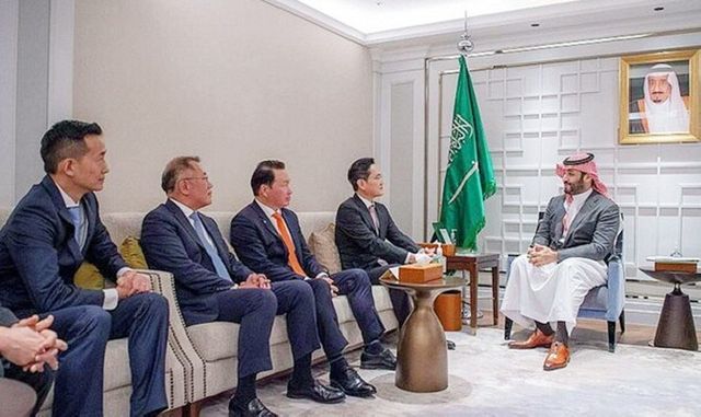 무함마드 빈 살만 사우디아라비아 왕세자 겸 총리(오른쪽)가 지난 2022년 11월17일 서울 소공동 롯데호텔에서 국내 기업 총수와 만나 대화를 나누고 있다. (왼쪽부터)김동관 한화그룹 부회장, 정의선 현대차그룹 회장, 최태원 SK그룹 회장, 이재용 삼성그룹 회장. ⓒ 연합뉴스