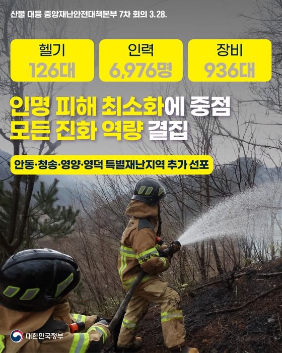또한 "산불이 민가·문화유산·다중이용시설·발전소와 같은 시설로 확산되지 않도록 산불확산지연제를 살포하고, 방화선을 구축해 저지하겠다"고 강조했다.