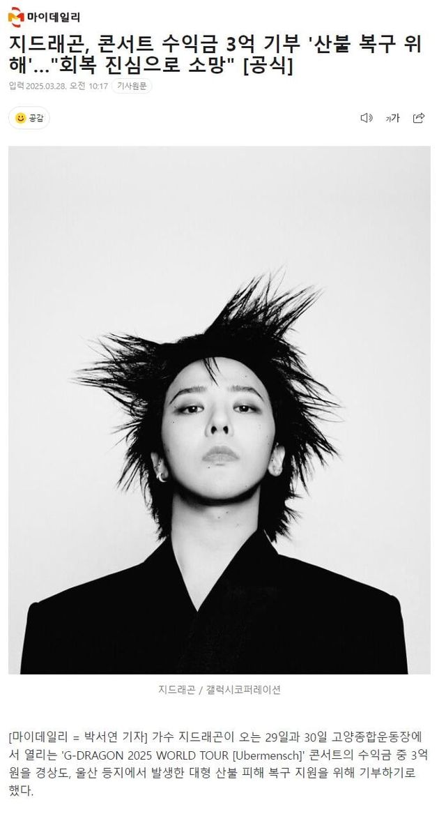 지드래곤, 콘서트 수익금 3억 기부 '산불 복구 위해'…"회복 진심으로 소망" [공식]
