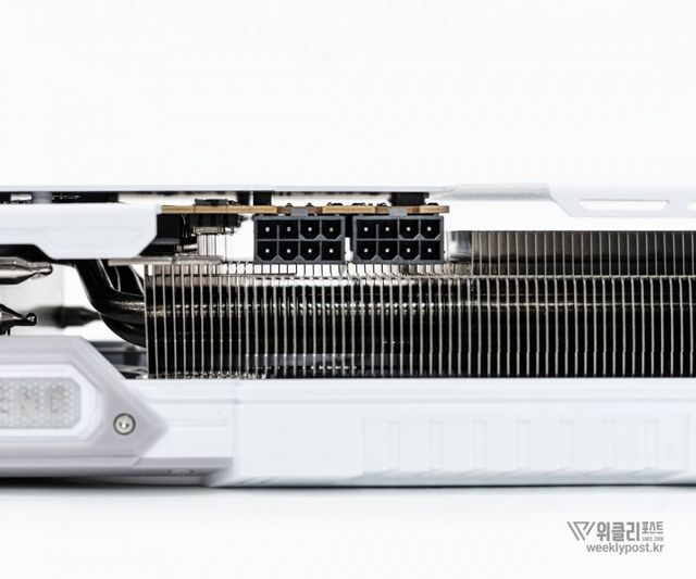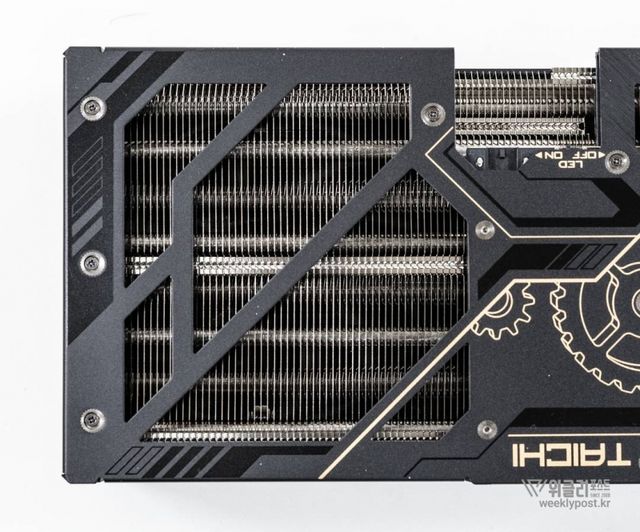 가로 길이는 330mm, 두께는 61mm다. 디자인에서 고급스러운 미학을 바로 느낄 수 있는 묵직한 블랙을 기반으로 했다. 방열판과 히트파이프를 결합하고 팬쿨러를 이용한 공랭방식으로 3개의 팬을 탑재했다. 특징적인 부분은 중앙 팬이 반대로 회전해서 난류를 줄이는 역회전 팬 설계다. 공기가 히트싱크 전체로 고르게 확산시켜 뛰어난 냉각효과를 제공한다. V자형 컷팅핀과 V자 공기 배출구를 통해 공기흐름을 규칙적으로 유도하며 타이치 3X 냉각 시스템을 통해 열효율과 정숙성 사이에서 최상의 균형을 추구했다.