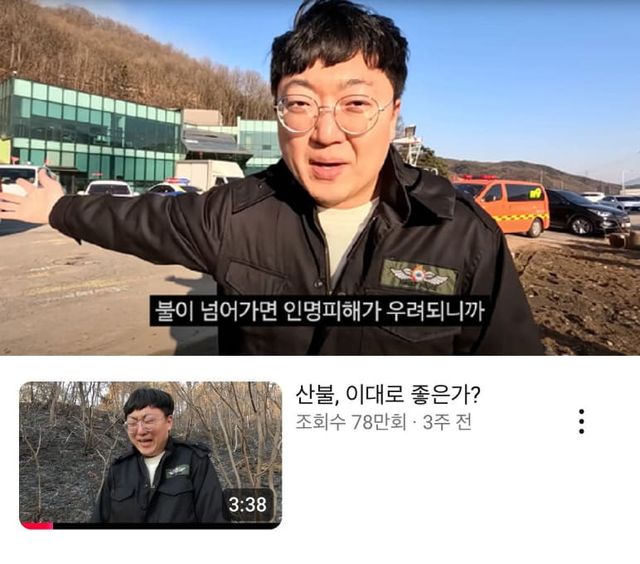 누리꾼들은 "몇 수 앞을 내다보신 거냐", "산불 소식에 이 영상이 알고리즘 타서 떴다. 신기하다", "산림청에서 '산불은 산림청이 끈다'는 걸 홍보하려고 온갖 노력을 해도 대중 인식을 바꾸는 게 불가능했는데 이 영상으로 해결됐다", "너무 장난스러운 섬네일 아닌가 하고 들어왔더니 3주 전 영상이었다", "산불 공무원이 제대로 된 옷, 장비, 신발 하나 없이 물 15리터 들고 산 올라가서 잔불 처리 다 하고 연기 다 마시며 고생하는 걸 알려야 한다", "산불로 관심 끄는 줄 알았는데. 될놈될(될 사람은 된다)이네", "당직, 지진, 제설, 산불 등 실무 콘텐츠 유익하고 재밌다" 등 반응을 보였습니다.