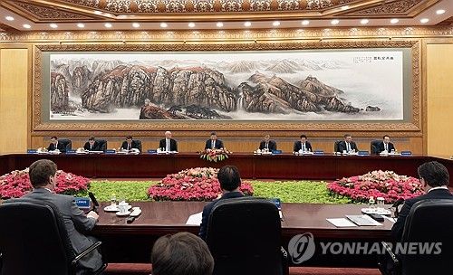 이날 면담에는 시 주석을 비롯해 차이치 당 중앙서기처 서기(공식 서열 5위), 외교 수장 왕이 당 중앙외사판공실 주임(외교부장 겸임), 경제 실세 허리펑 부총리와 경제 분야 장관들이 총출동했다.