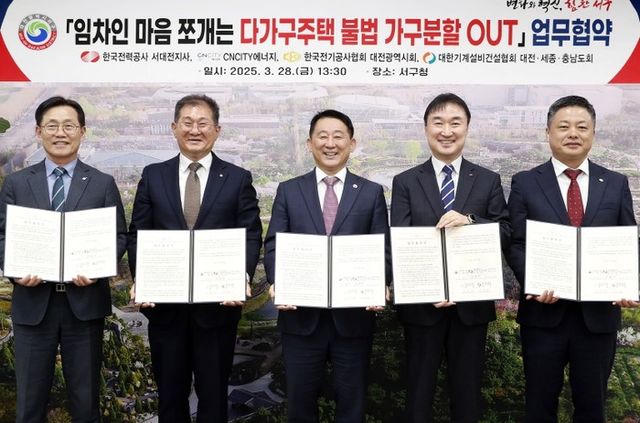 [파이낸셜경제=김예빈 기자] 대전 서구는 3월 28일 서구청 갑천누리실에서 다가구주택 불법 가구분할 방지(예방)을 위한‘임차인 마음 쪼개는 다가구주택 불법 가구분할 OUT 업무협약’을 체결했다고 밝혔다.