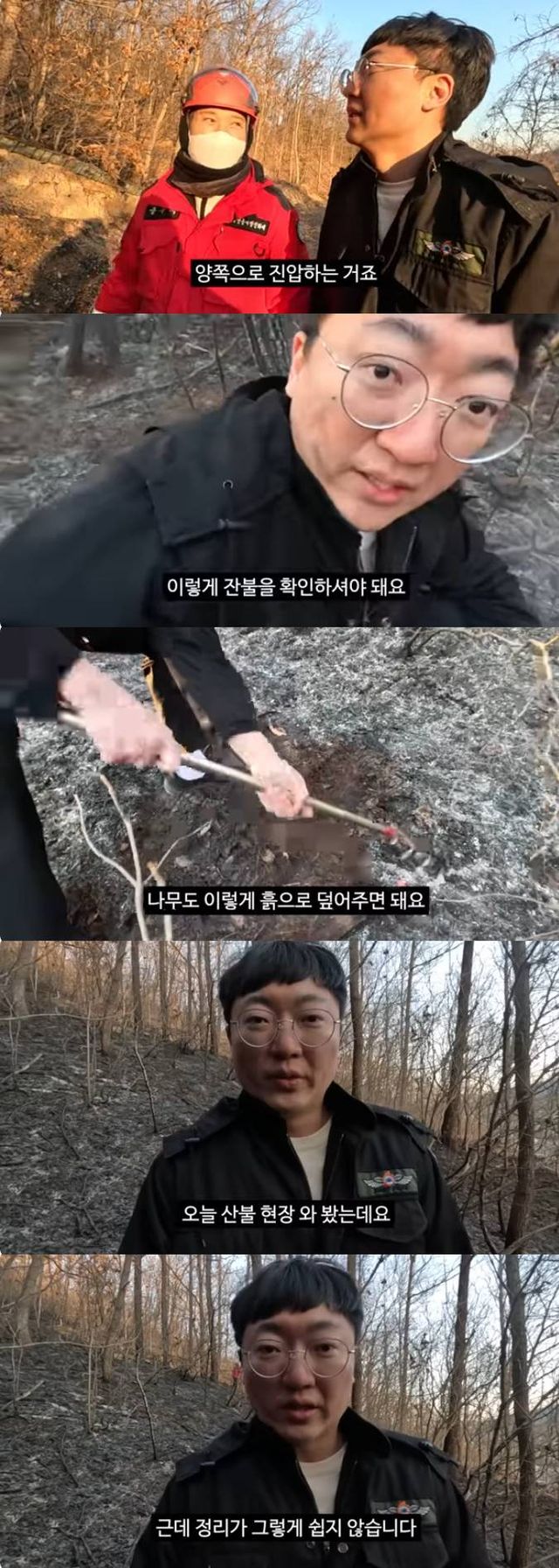 그는 "이렇게 잔불을 확인해야한다"며 갈퀴로 흙을 뒤집어 덮은 뒤 연기가 나지 않도록 잔불 정리를 한다고 설명했다.